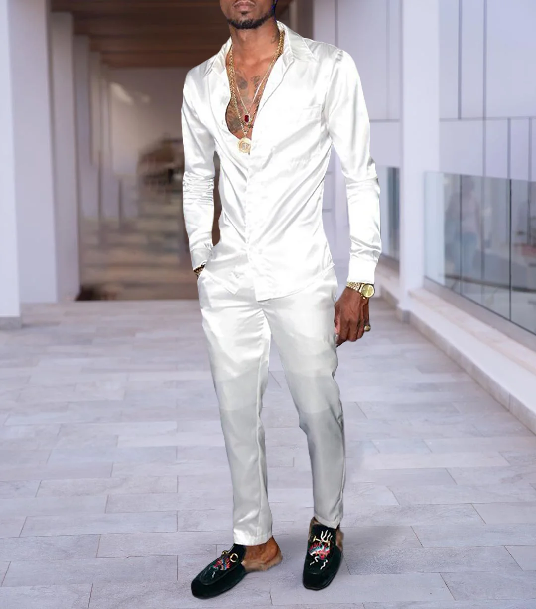 This classic white shirt and pants set has a lapel collar and a slim fit. Made with stretchy, comfortable fabric for just the right amount of looseness,so that you feel free to wear, suitable for wearing from the office to the dinner party.