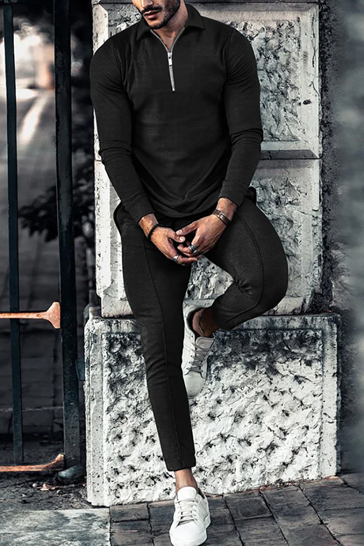 BrosWear Casual Black Polo Shirt And Pants Two Piece Set